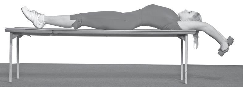 И.П.: Лежа на краю кровати, вдоль, на спине. Одна рука держится за край, в другой руке, прямой и перпендикулярной кровати, гантель весом от 2 до 5–8 кг. Опускайте руку с гантелей в сторону ниже уровня кровати на выдохе, затем поднимайте ее в исходное положение. При этом максимально растягивается одна половина грудной клетки (см. фото 6 а, б). Повторить другой рукой.