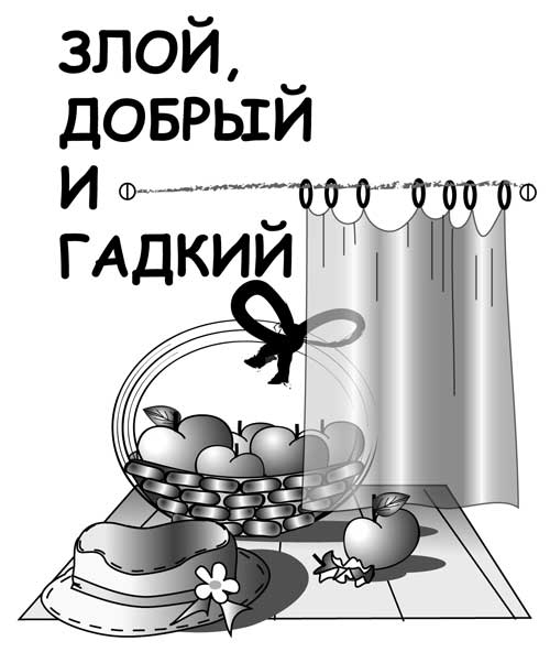 Добрый задумывается. Гадкий торопливо тащит из корзинки Доброго два яблока, прячет за пазухой. Чуть помедлив, берёт еще одно.