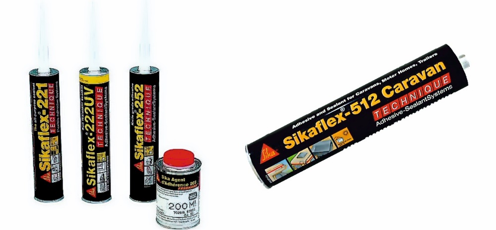 На сегодняшний день, при строительстве техники для караванинга, большое применение получили полиуретановые клеи-герметики фирмы «SIKA»: серии Сикафлекс («Sikaflex 221») и «Sikaflex 512». Эти герметики используются не только при постройке, ремонте жилых прицепов и автодомов, но и в судостроении. Они способны склеивать между собой совершенно разные материалы, при этом оставаясь прочными, не затвердеващими и эластичными. Например, герметик «Sikaflex 221» стоек к обычной, морской, известковой, сточной воде, а также к слабым кислотным и щелочным растворам. Герметик «Sikaflex 512 Caravan» по всем характеристикам точно такой же, как и «Sikaflex 221», но главное отличие – это особая стойкость к ультрафиолетовому излучению. Поэтому его используют на всех этапах производства и ремонта техники для караванинга: от герметизации швов боковых стеновых панелей, крышных люков и врезке окон, до герметизации болтов при установки маркиз, – и там, где необходимо склеить детали из разных материалов11. Эти герметики имеет слабо выраженный запах. Цвет может быть: белый, черный, серый.