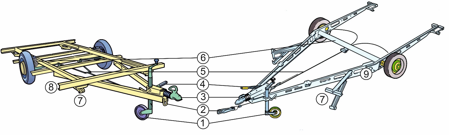 Рисунок 4.1. Рама прицепа из металлического проката и штампованных лонжеронов. 1 – опорное колесо; 2 – крюк или страховочный тросик; 3 – сцепная головка; 4 – рычаг тормоза – наката; 5 – тяги тормоза – наката; 6 – независимая ось (слева пружинно-амортизаторная, справа – торсионная); 7 – упорная ножка; 8 – рама из П-образного металлического проката; 9 – штампованный лонжерон.