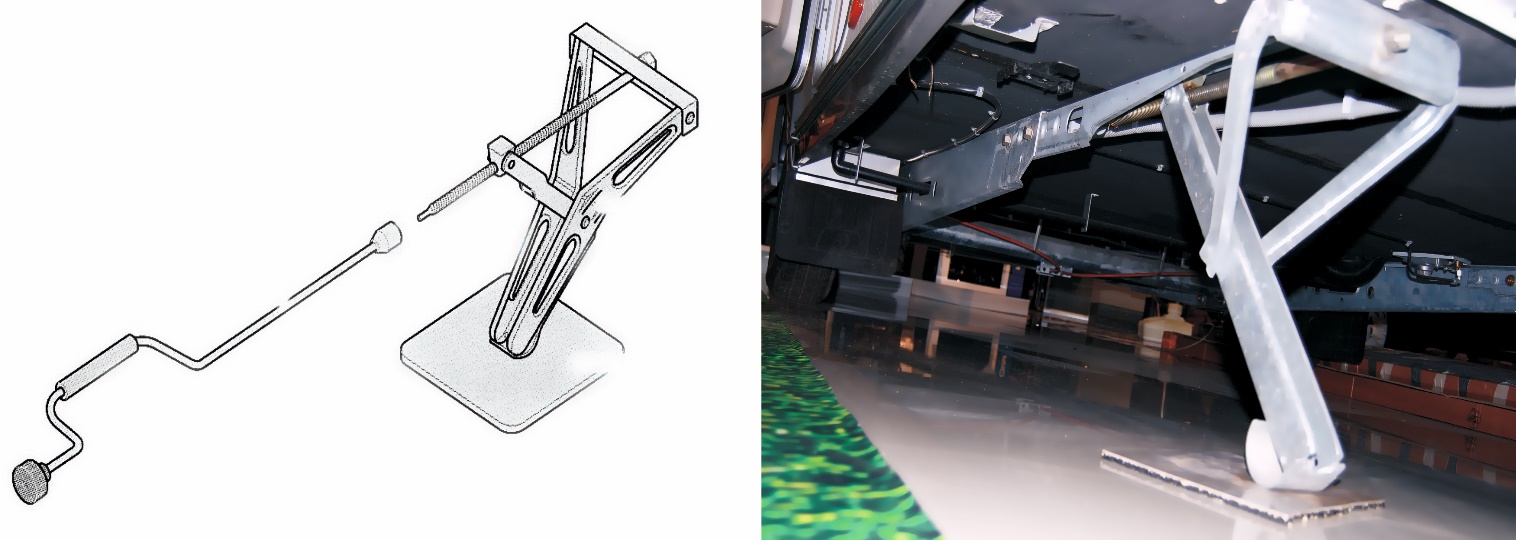 На рамы жилых прицепов монтируют опорные ножки, которые необходимы для выравнивания прицепа относительно горизонта во время стоянки. Опорная ножка имеет три точки крепления: две на площадке, а третья крепится через направляющий шток к раме. Принцип работы очень простой: при вращении штока по часовой стрелке штанга с пяткой начинает движение по штоку, по специальной направляющей, и пята опускается. При вращении в противоположную сторону упор принимает первоначальное транспортное положение. Опорные ножки имеют разные размеры и рассчитаны на различные весовые нагрузки. На жилых прицепах, как правило, устанавливают упоры с небольшим запасом по грузоподъемности. При эксплуатации каравана старайтесь сильно не нагружать без надобности опорные ножки. В противном случае вы погнете шток с резьбой, и механизм перестанет нормально работать.13 При правильной эксплуатации выдвижной механизм должен быть прямой и слегка смазан, чтобы на нем не собиралась грязь. Для увеличения площади опоры и уменьшения давления на грунт, под упорные ножки подкладывают различные подкладки из фанеры или других подручных материалов. Но на самом деле в ножках уже предусмотрены места для крепления дополнительных пластмассовых пяток, которые приобретаются отдельно.