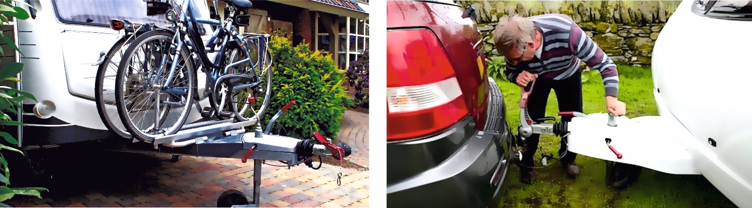 Рисунок 4.3. Слева – дышло жилого прицепа с установленной на нем вело подвеской. Справа – присоединение каравана к тягачу, при помощи опорного колеса.