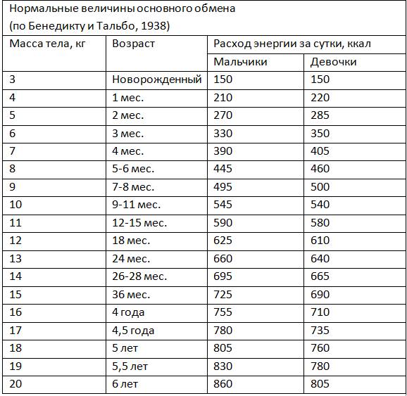 Табл. 1. Энергетический обмен детей от рождения до 6 лет