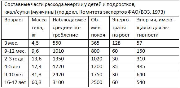 Ниже представлены таблицы энергопотребления в зависимости от пола и возраста детей без учёта их роста и физического развития.