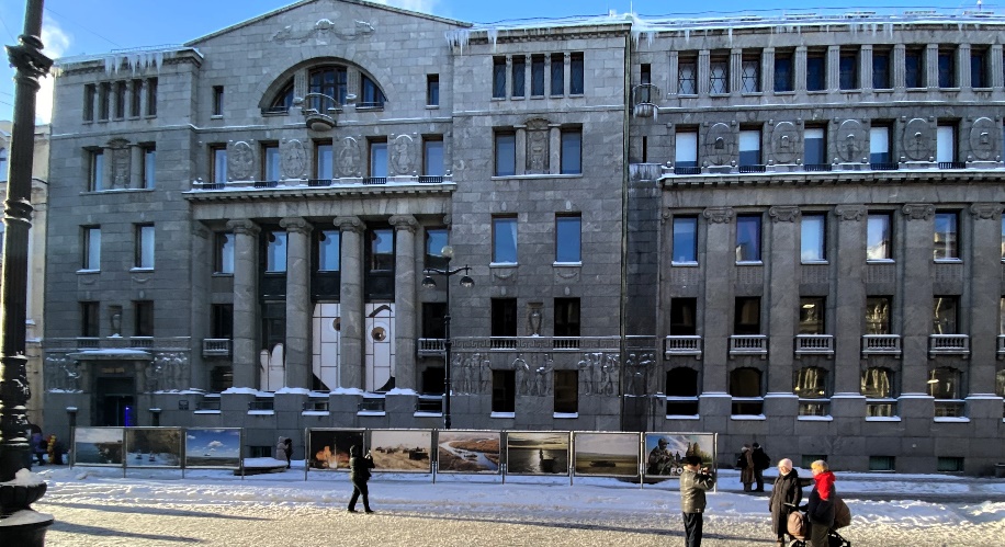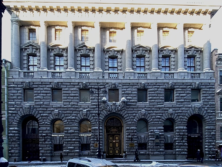 Задержимся напротив массивного, сплошь облицованного рваным серым гранитом, здания под номером 15. Оно было построено в 1912-1914 годах для Русского торгово-промышленного банка по проекту архитекторора Мариана Мариановича Перетятковича в стиле неоренессанс. На мощный трехэтажный цоколь опирается восьмиколонный портик, завершённый аттиком. Фасад украшен масками, желудями, бараньими головами, мужскими профилями, рыцарскими доспехами. Над главным входом красуются рога изобилия – для банка более чем уместно. Отделка интерьеров вызывала восторженные отзывы современников и восхищает по сей день. Особенно поражают редкие породы мраморов: черный с золотистыми жилками итальянский портор, зелёный и красный левантийские мраморы.