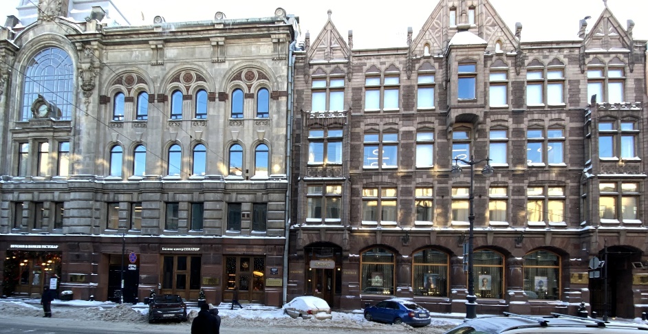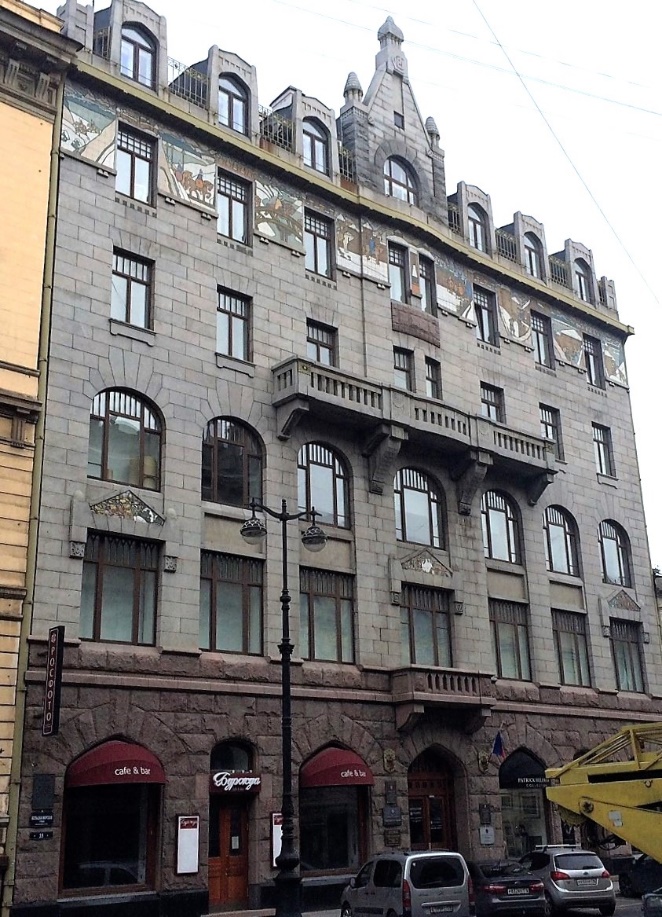 Дом 35 – образец «северного модерна», был сооружён в 1905-1907 годах по проекту гражданского инженера Александра Александровича Гимпеля. Цоколь здания в традициях стиля имитирует скалу, на высоком фронтоне буквы «СОР» (Страховое общество Россия). Майоликовые картинки, украшающие серый фасад, выполнены по рисункам Николая Константиновича Рериха на сюжеты «русского севера». Надо отметить, что весь майоликовый фриз погиб в годы блокады, и был восстановлен по старым фотографиям в 2007 году. Треугольные вставки над окнами второго этажа являются подлинными.