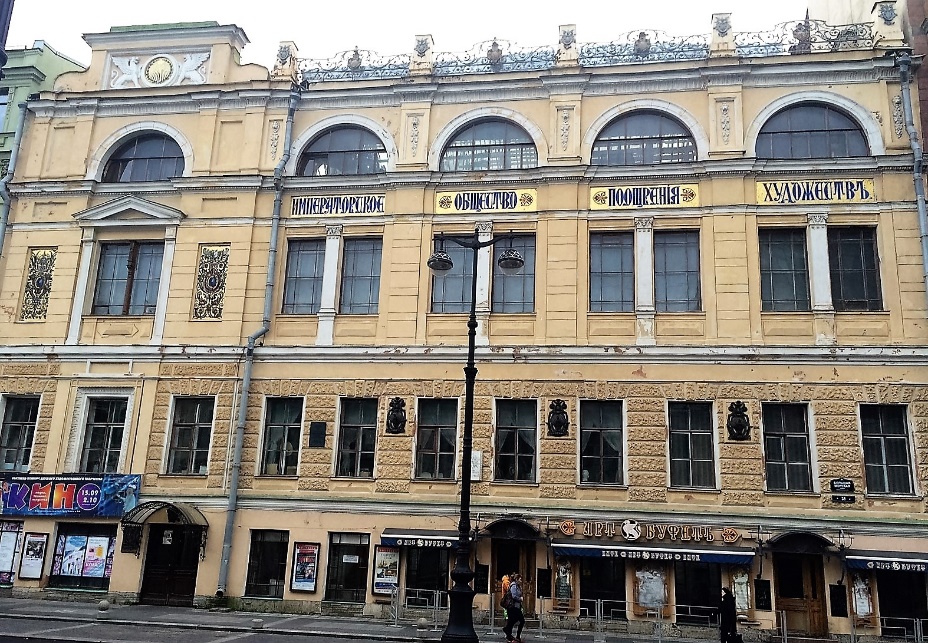В 1877-1878 годах архитектор Максимилиан Егорович Месмахер перестроил здание для рисовальной школы «Императорского общества поощрения художеств», основанного ещё в 1821 году. В 1890-1893 годах архитектор Иероним Севастьянович Китнер несколько изменил фасад, украсив его мозаичными панно. В это же время над левой частью здания была установлена великолепная композиция «Гений искусства», выполненная скульптором Робертом Романовичем Бахом.