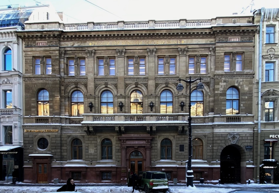 Участок под номером 32 занимает здание, спроектированное и построенное в 1877-1878 годах по заказу Русского для внешней торговли банка. Это был первый опыт сооружения банковских зданий в Санкт-Петербурге. Архитектор Виктор Александрович Шретер предусмотрел облицовку фасада вюртембергскими песчаниками разной окраски: цоколь и портал с колоннами – красными, бельэтаж – зелёными, а верхние этажи – желтыми. Перекрытие над большим операционным залом было устроено по фермам, опирающимся на колонны. Освещение зала через стеклянный купол придавало всей конструкции воздушность и лёгкость.