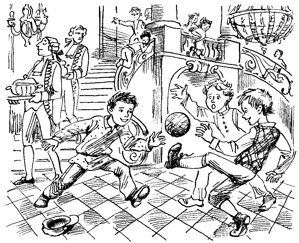 В плохую погоду игры переносились во дворец. Поначалу лакеи ворчали. Дети оставляли на полу грязные следы, и приходилось то и дело подметать да подтирать блестящий, как зеркало, паркет. Зато теперь обращалось меньше внимания на такую ерунду, как непришитая пуговица, неряшливая причёска и прочее, и у лакеев оставалось больше свободного времени. И потом, раньше во дворце царила гробовая тишина и становилось порой жутковато. То ли дело теперь: смех, беготня, крик. Часто в играх принимал участие весёлый капитан. А случалось, и старый доктор пускался в пляс или скакал через верёвочку. Вот потеха!