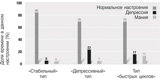 Остальные пациенты делились на две практически равные группы. Одна – «депрессивного» типа, у которой на протяжении 23 % от общего времени наблюдались хотя бы какие-то симптомы депрессии. Вторая группа пребывала в ремиссии 70 % времени, а период клинических проявлений примерно в равных частях был представлен симптомами депрессии и мании. Эту так называемую группу «быстрых циклов» составляли пациенты с более частыми, но короткими периодами обострения. Как упоминалось выше, «стабильная» группа наблюдалась на протяжении многих лет и хорошо отвечала на лечение препаратами лития. Возможность достоверного выделения больных, которые хуже реагируют на применение лития, может оказаться полезной для поиска эффективной терапии (рис. 2.3).