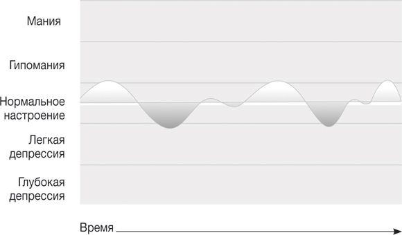 У людей с циклотимическим расстройством отмечаются кратковременные частые периоды депрессивных симптомов и гипомании, перемежаемые непродолжительными периодами нормального настроения. При этом у пациентов не наблюдаются эпизоды ни полностью развившейся мании, ни глубокой депрессии. Закономерность проявления симптомов циклотимического расстройства представлена на рис. 2.5. По существу, эти люди постоянно пребывают в циклической смене легкой депрессии и легкой приподнятости настроения.