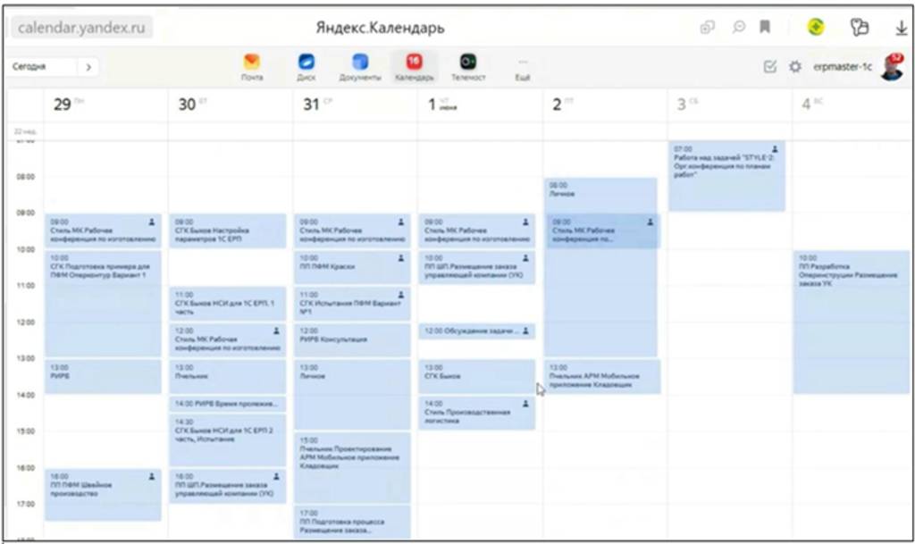 Яндекс.Календарь, как и Яндекс.Трекер, используется нами как один из вспомогательных инструментов управления проектов, который в реальном времени можно увидеть на какой стадии проект, по каким задачам исполнитель вырабатывает решения.