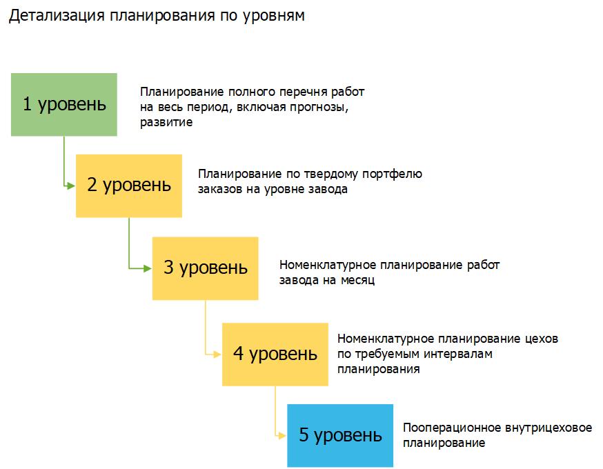 3 уровень – существует номенклатурное планирование завода по производству на месяц. Условно уровень планово-диспетчерского отдела.