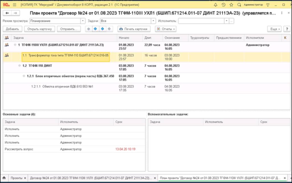 Схема 7. Управление проектом. КТ, ИСР, ВЕХИ, Задачи в 1С:Документооборот график Ганта по DD MRP