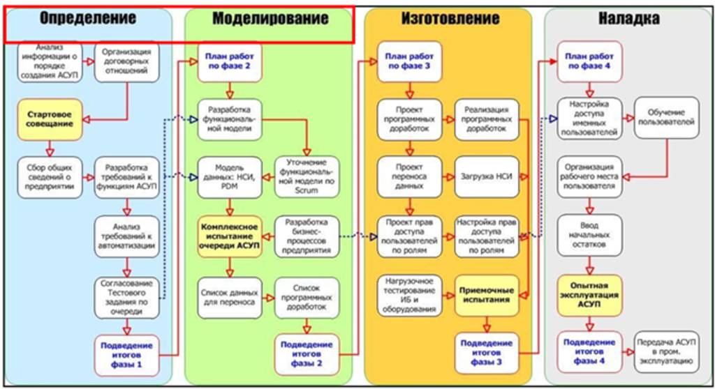 Мы объединяем фазы «Определение» и «Моделирование» в одну фазу, в которой проводим процессно-функциональное моделирование.