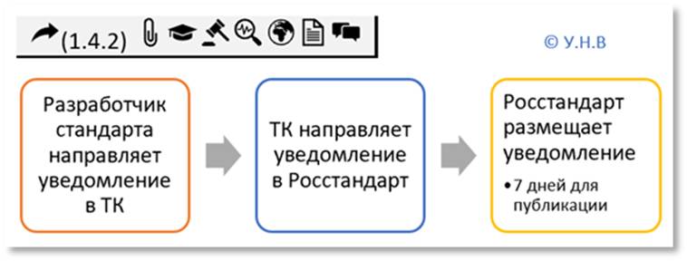Разработчик стандарта направляет уведомление о разработке проекта национального стандарта в технический комитет, а при его отсутствии в Росстандарт [2]. Технический комитет направляет уведомление в Росстандарт для размещения на официальном сайте. Росстандарт в срок не позднее чем в течение семи дней со дня поступления уведомления о разработке проекта национального стандарта размещает такое уведомление на своём официальном сайте. Дальнейший порядок разработки и утверждения национальных стандартов представлен на рисунке 1.3. Уведомление должно содержать информацию о положениях, которые имеются в проекте стандарта и отличаются от положений соответствующих международных стандартов [2].