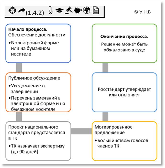 Порядок разработки и утверждения национальных стандартов представлен на рисунке 1.3. Как видно из рисунка все процессы носят уведомительный характер, т.е. у регулятора нет оснований для отказа в приёме уведомления. Уведомительный принцип часто используется в либерально-демократической системе управления, например, для организации митинга в Москве и других Российских городах, организаторы уведомляют, а не спрашивают разрешение у глав города. Аналогичные уведомления, а не разрешения, направляют специалисты информационной безопасности в Роскомнадзор для получения статуса оператора обработки персональных данных.