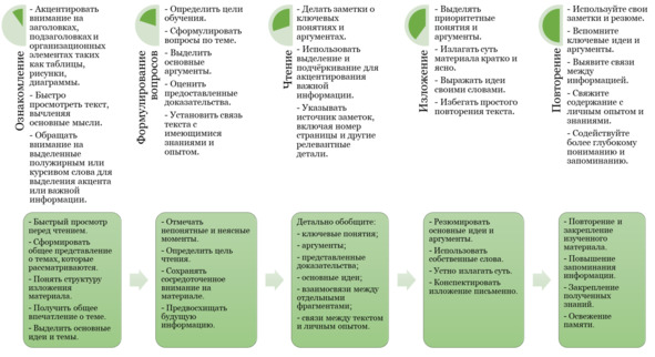 5. Повторение (Review). На последнем этапе читатели осмысливают материал и возвращаются к своим вопросам, сформулированным перед чтением, чтобы проверить, были ли на них найдены ответы. Они также перечитывают свои краткие изложения, чтобы закрепить полученные знания.