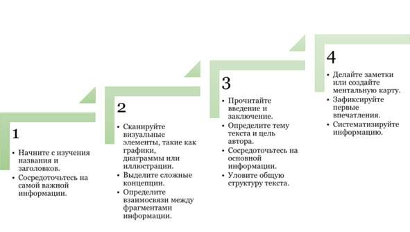1. Ознакомление (Survey). На этом этапе читатели быстро просматривают текст для получения общего представления о его структуре, заголовках, подзаголовках и визуальных элементах. Этот обзор помогает создать ментальную карту содержания перед более глубоким изучением материала.