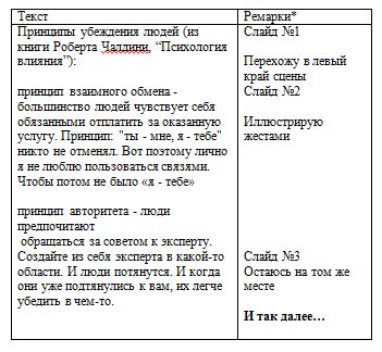 Подобное оформление поможет вам структурировать не только сам сценарий, но и ваше поведение перед публикой – в каком месте вы должны стоять в тот или иной момент вашего выступления, какой слайд надо включить, какой трек или видеоряд должен начаться и так далее.