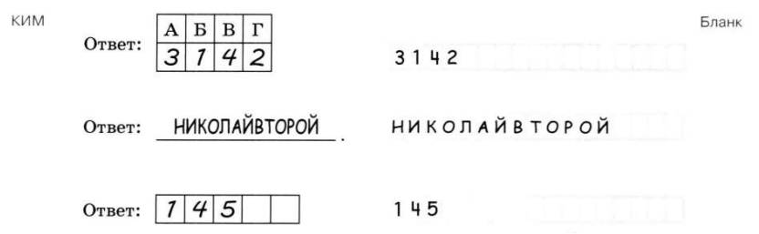 Ответами к заданиям 1–12 являются последовательность цифр или слово (словосочетание). Сначала укажите ответы в тексте работы, а затем перенесите их в БЛАНК ОТВЕТОВ №1 справа от номера соответствующего задания, начиная с первой клеточки, без пробелов, запятых и других дополнительных символов. Каждую букву или цифру пишите в отдельной клеточке в соответствии с приведёнными в бланке образцами. Имена российских государей следует писать только буквами (например, НиколайВторой).