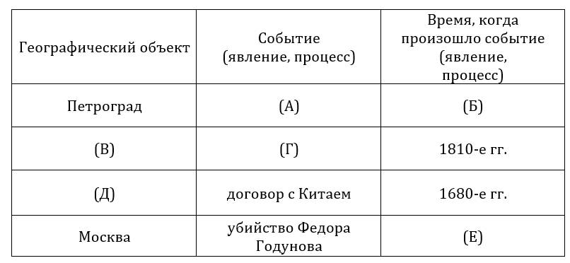 4. Заполните пустые ячейки таблицы, используя приведённый ниже список пропущенных элементов: для каждого пропуска, обозначенного буквой, выберите номер нужного элемента.