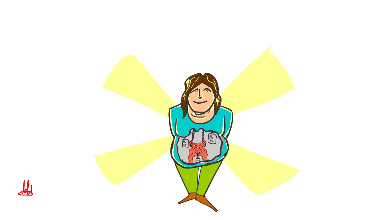 Я попросила своего сына – юного художника нарисовать картинку к теме подавленные эмоции. Мы с ним рассуждали, как бы это могло выглядеть при лишнем весе. Примерно так: человек явно добродушный, тучный, внутри его живота 16 килограммовые гири, которые сдерживают внутренний гнев, злость и другие отрицательные эмоции.