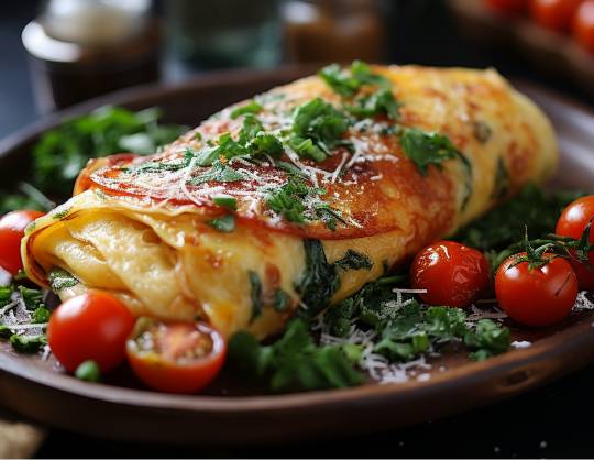 Яйца взбить с молоком, добавить томаты, зелень, соль, вылить на сковороду без масла, к получившемуся омлету добавить сыр