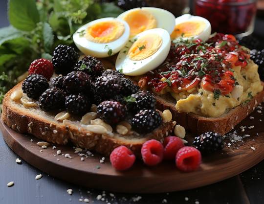Намазываем 1 кусочек хлеба арахисовой пастой, на другой разминаем вилкой авокадо. Украшаем вареным яйцом и ягодами.