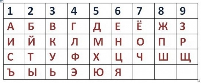 Затем внимательно смотрим в таблицу и под каждой буквой пишем относящуюся к ней цифру.