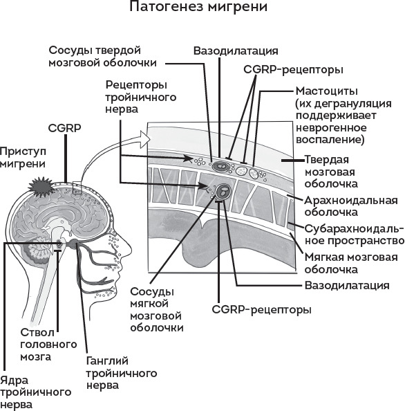 Кальцитонин ген-родственный пептид (КГРП) – белок связанный с геном кальцитонина (calcitonin generelated peptide CGRP). Пептид широко представлен в центральной и периферической нервной системе. Он является нейротрансмиттером, который вызывает вазодилатацию (расширение сосуда). Как было показано в современных исследованиях, по сравнению с группой здоровых добровольцев без анамнеза головной боли, CGRP повышен в крови у женщин с мигренью.