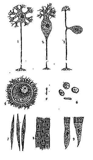6 – красные кровяные тельца; 7, 8 – клетки мышц; 9 – реснитчатые клетки эпителия.