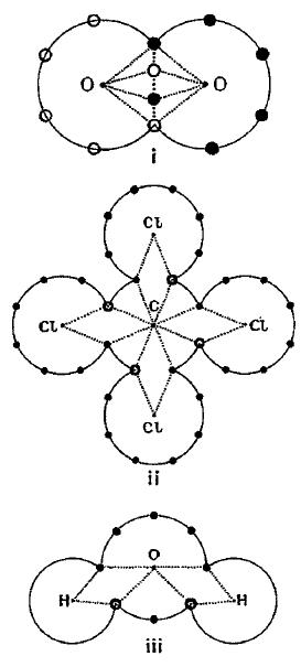 Ковалентные связи. Схемы молекул (i) кислорода, (ii) четыреххлористого углерода, (iii) воды. Я добавил пунктирные линии для обозначения «двойного гражданства» общего электрона.