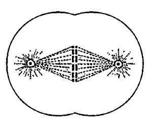 Стадия в митотическом делении животной клетки (схематично). Хромосомы, составляющие метафазную пластинку, с одной из двух сторон сцеплены с центросферой, посредством ядерной оси.