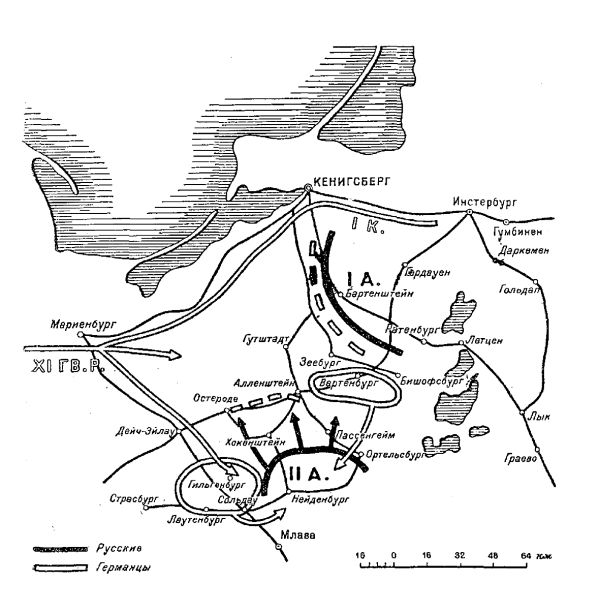 Наличие широко и обдуманно построенной сети железных дорог позволило немцам совершить указанную переброску, разбить русские войска и очистить Восточную Пруссию (схема 1).