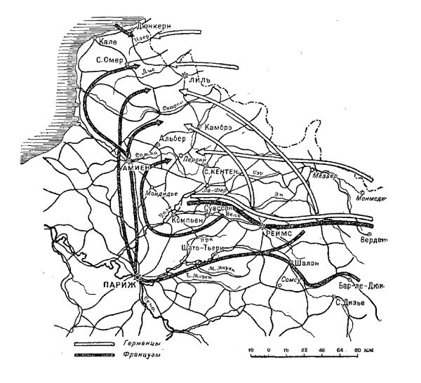 II. После битвы на Марне и отхода немцев на р. Эн Оба противника стремились выиграть) открытый фланг («Бег к морю»), для чего стали перебрасывать войска по железным дорогам. Ввиду того, что эта операция проводилась одновременно обеими сторонами и почти одинаковыми силами, выигрыш фланга оказался невозможным, и обе враждующие стороны остановились, когда их фланги оказались припертыми к морю (схема 2).