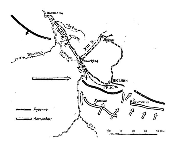 Встречное столкновение правого фланга русских армий с левым флангом австро-венгерских сил привело к ряду тяжелых боев для русских войск (Люблинские бои). Фронт русских заколебался, и уже) намечался отход! армий. Верховное командование бросает два корпуса (гвардейский и XIII), сосредоточивающиеся на северо-западном фронте (район Варшавы), на помощь начинающим колебаться армиям, просто переадресовкой эшелонов на юго-западный фронт, и русские, получившие перевес в силах, разбивают австро-венгерские армии (схема 3).