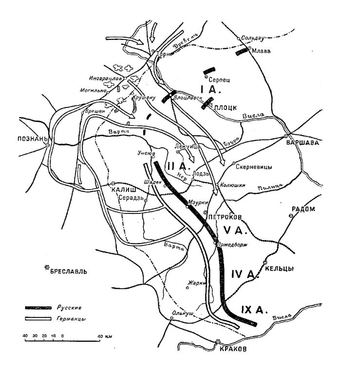 IV. После неудачного наступления соединенных австро-германских сил на Варшаву-Ивангород (октябрь 1914 г.) Гинденбург решил отвести свои силы к границе, совершить маневр по своей густой сети пограничных железных дорог и нанести новый удар по слабому месту русского фронта. Отход немцев сопровождался тщательным разрушением путей сообщения, почему русские армии не могли развить преследования. Оторвавшись от русских войск, Гинденбург перебрасывает часть своих сил (до 5½ корпусов) в район крепости Торн и наносит удар по слабому месту – открытому флангу 2-й русской армии в общем направлении Лодзь-Лович-Колюшки-Скерневицы, перерезая железные дороги 2-й и 5-й русских армий, т. е. удар по сообщениям (схема 4).