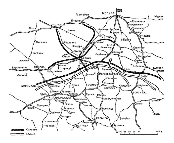 В гражданскую войну, когда волна наступления Деникина (1919 г.) захлестнула весь юг и, выйдя на линию Орел-Елец-Тамбов, угрожала Туле[2] и Москве, спасти положение много помогли железные дороги, по которым к Брянску были переброшены резервы (ударная группа латышских, эстонских частей и 45-я дивизия). Сосредоточение производилось со средней суточной скоростью эшелона 600 км, что по состоянию транспорта 1919 г. должно быть признано отличным. Армия Деникина получила встречный удар и, разбитая, отхлынула обратно (схема 5).