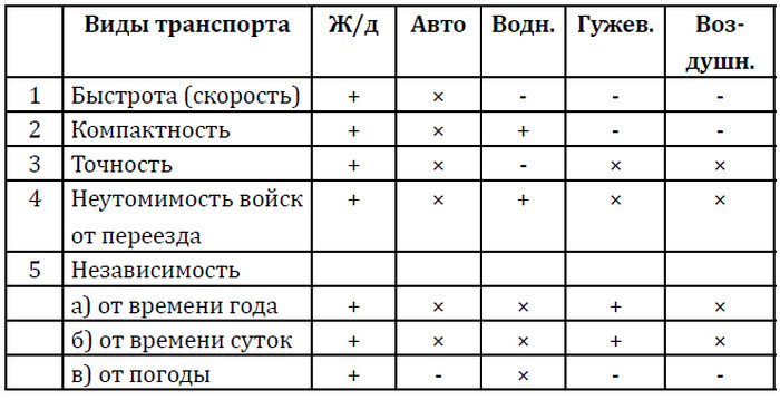 Железные дороги как пути сообщения и как транспорт имеют много положительных сторон и с узко военной точки зрения. Положительные стороны, следующие: 1) быстрота перевозок, фактор, имеющий особенно важное значение для ведения боевых операций; 2) компактность перевозок, дающая возможность более или менее одновременно перебрасывать большое количество грузов; 3)точность перевозок, обеспечивающая командованию выполнение маневра точным расчетом переброски войск; 4) незначительное утомление от переезда, почему непосредственно из вагонов войска могут быть брошены в бой, что и делалось, например с сибирскими корпусами под Варшавой в мировую войну; немцы считали, что переброска войск с западного фронта на восточный и обратно служила одновременно Отдыхом перевозимых частей; резервы, брошенные на спасение красной столицы – Ленинграда (Петрограда), прямо из вагонов шли в бой; 5) независимость от времени суток, года и даже погоды (кроме стихийных явлений, например, снежные заносы), дающая возможность производить перевозки непрерывно.