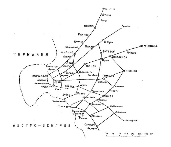 В 1920 г., к моменту начала активных действий на западном фронте, обе армии (Красная и белополяков) пользовались отрезками прежних русских стратегических дорог, и поэтом в смысле магистральных (продольных) линий обе армии находились в равных условиях. Количество же рокадных дорог на территории бывшего царства польского было значительно больше, почему Польша в 1920 г. располагала более выгодным начертанием сети железных дорог и широко пользовалась ими для производства перегруппировок.