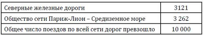 Мобилизационные перевозки во Франции в 1914 г. протекли следующим порядком: в 01 мин. 2 августа 1914 года все железные дороги перешли в распоряжение военного командования. Все соединительные пути, разъезды и все воинское оборудование, бездействовавшее в мирное время, были открыты. Коммерческие поезда заканчивали движение по коммерческому графику (мирного времени) к 24 час. 2 августа. С 3 августа вошло в силу воинское расписание движения поездов, когда все поезда пошли с одинаковой скоростью – параллельный график, дающий возможность максимального использования пропускной способности дороги. Уже с 3 августа станции и поезда были переполнены резервистами, следующими к месту призыва. Одновременно шло движение поездов с войсками прикрытия к границам Франции. Сведения о числе поездов, пущенных в обращение в дни мобилизации 3, 4 и 5 августа.