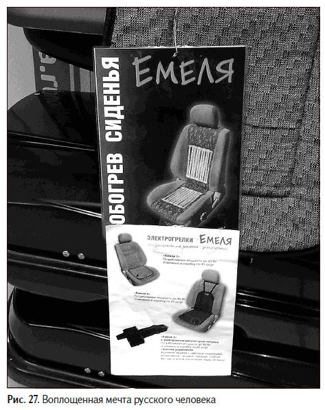 Русский человек, греющий спину на печи. А в это время печка сама везет его туда, куда нужно, и делает за него то, что ему необходимо. Теперь подумайте, как вы отнесетесь к обогревателю автомобильного кресла с названием «Емеля»? Теплая сказочная атмосфера мгновенно переходит на новый товар (рис. 27). Вы обращаете на него внимание. При этом многое про новинку вам понятно уже заранее и без лишних слов. Расстояние до покупки стремительно сокращается.