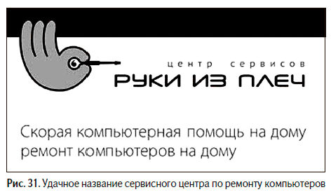 Приведу еще один типично русский пример (рис. 31). Только теперь это название уже не товара, а услуги. Точнее, целого класса услуг. Заинтересовались бы вы сервисным центром по ремонту компьютеров «Руки из плеч»? Захотели бы познакомиться с таким центром поближе? Вопросы риторические.