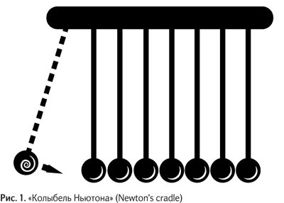 Представьте себе несколько одинаковых шаров, подвешенных к потолку на тонких нитях одинаковой длины. В физике такая механическая система называется «Колыбелью Ньютона» (рис. 1). Мы отводим крайний левый шар в сторону и отпускаем его.