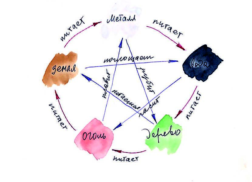 Вода способна тушить огонь, огонь плавит железо, железо (топор) может срубить дерево, дерево питается из земли, земля впитывает воду. Мир – в гармонии.
