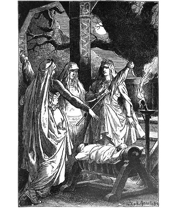 Далее автор говорит о трех девах из Йотунхейма. В подстрочном переводе характерен такой эпитет для этих дев, как Ámáttkar, переводимый, как «ужасный» или «злой». Это слово часто употреблялось по отношению к колдунам и ведьмам, однако этот эпитет здесь имеет не негативную коннотацию, а пояснительную. Да, действительно, автор песни упоминает, что Девы являлись великаншами, однако этот эпитет скорее говорит не об их расе, а об их ведовских способностях. Вероятно, в данном контексте речь идет о трех норнах – женщинах, наделенных даром определять судьбу богов и людей. Имена норн также архетипичны: Урд означает прошлое, Верданди – настоящее, и Скульд – будущее. Хотя многие исследователи не согласны с этим тезисом, но вполне вероятно, что норны появились из расы йотунов, которую викинги считали «прошлой» великой цивилизацией. Весьма странно, что на этом роль трех дев внезапно обрывается.