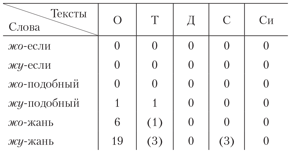 Мною были рассмотрены: 1) основной текст «Книги Перемен» (О), 2) «Туань-чжуань» (Т), 3) «Да сян-чжуань» (Д), 4) «Сяо сян-чжуань» (С) и 5) «Сицы-чжуань» (Си) со стороны следующих слов: жо, жу и жань.