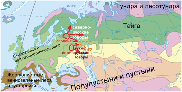 Рисунок 2. Расселение словен и вятичей на восток. Оранжевым пунктиром показана южная граница северного и северная граница южного русских говоров. Между ними – среднерусские говоры смешанного происхождения, сложившиеся на основе говоров словен, кривичей, вятичей и местного финно-угорского населения.