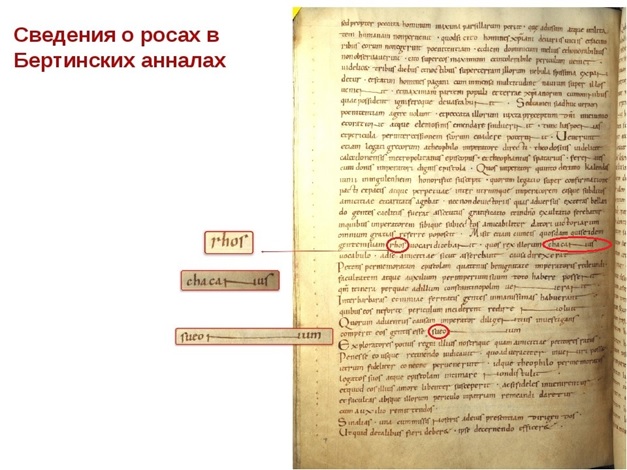 Бертинские же анналы повествуют, что в 839 году от Рождества Христова ко двору восточнофранкского императора Людовика Благочестивого прибыло византийское посольство, с которым ехали некие послы хакана русов, кружным путём возвращавшиеся из Константинополя в свою страну.